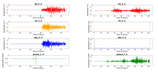 Feature F4 of real part Re_F_4, imaginary part Im_F_4, absolute value abs_F_4, and the phase angle phase_F_4 over the measurements for bearing A (left) and bearing J (right); bearing type FAG 6205 C C3; C/P = 1.6, n = 5000 rpm, , , β = 0°.
