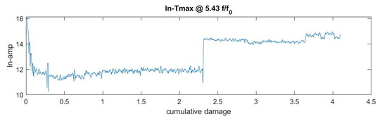 Examining the entire spectrum is very computationally intensive due to the large amount of data involved. It was recommended to minimize the entire spectrum to bearing-specific frequencies, such as the frequency of the shaft, the BPFI, and the BPFO. Here, not only the exact frequency of the calculated specific frequencies was taken from the FFT, but also an interval so that the desired frequency can be found in the interval despite measurement inaccuracies, etc. The maximum value of the restricted FFT vector per measurement point was then used to display it in a 2D plot. The following Figure 19 shows the maximum value of the interval of order 5.43, which corresponds to the BPFI of bearing type 6205 at a contact angle of 0°. In this figure, a step at a cumulative damage of ~2.3 can be seen, which indicates a damage.