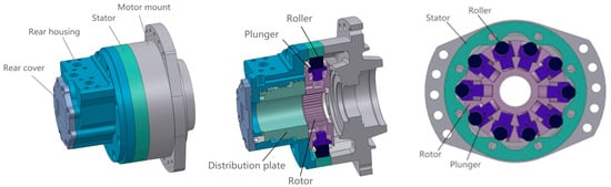 As shown in Figure 1, the radial piston motor is mainly composed of components such as the Rear cover, Rear housing, Stator, Motor mount, Plunger, Roller, Distribution plate, and Rotor. The stator guide rail of the motor is fixed to the motor mount and the distribution plate and motor mount form the internal flow passages of the motor. The flow from the hydraulic system drives the rotor to rotate, with ten plungers positioned within the ten plunger chambers on the rotor. The rollers are fitted to the outer ends of the plungers and run closely against the inner side of the stator during operation.