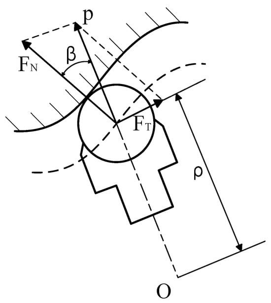 The interaction between the roller and the stator guide rail is illustrated in Figure 2. In the figure, ρ is the distance from the center of the roller to the center of rotation of the rotor and p is the hydraulic pressure acting outward along the axis of the plunger under the action of hydraulic fluid. This force is divided into two components at the contact between the roller and the guide rail: FN and FT. FN is the normal pressure perpendicular to the contact surface between the roller and the guide rail, where β is the angle between p and FN. FT is the tangential force that drives the rotation of the rotor.