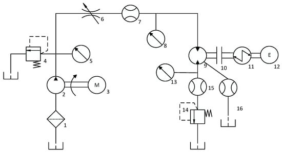Schematic diagram of hydraulic system: 1 Filter; 2 Hydraulic pump; 3 Motor; 4, 14 Relief valve; 5, 8, 13 Pressure gauge; 6 Throttle valve; 7, 15, 16 Flow meter; 9 Radial plunger motor; 10 Coupling; 11 Torque sensor; 12 Load motor.