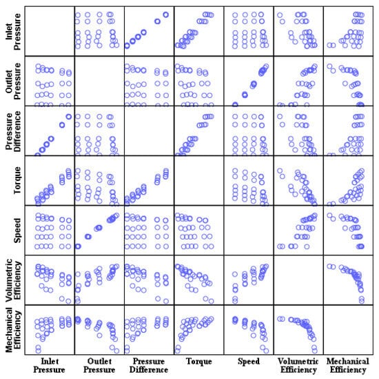 Figure 5 is a matrix scatter plot, showing a linear positive correlation between the speed and outlet pressure. This adjustment in outlet pressure at each speed test point is to prevent issues such as clearance and impact between plungers and rollers as the speed increases. There is a clear positive correlation between the output torque and inlet pressure. However, there is no apparent linear relationship between the mechanical efficiency and other parameters. Selecting mechanical efficiency as the dependent variable is more appropriate in this case.