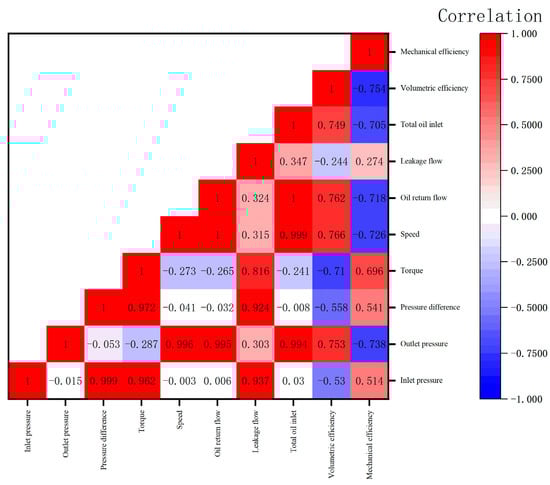 The main input conditions of the hydraulic system include the inlet pressure, outlet pressure, and flow rate. Multiple linear regression requires the independent variable data to be mutually independent, so a correlation analysis can be performed first to select the independent variables. Considering the relationship between torque and inlet pressure, this study attempts to use mechanical efficiency as the dependent variable and the input conditions from the experimental data as independent variables. Multiple linear regression is then used to fit the mechanical efficiency.