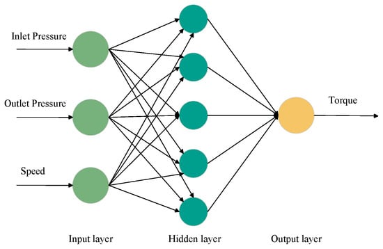 The hydraulic system flow rate controls the speed of the motor, and for a hydraulic motor, the input signals can be considered as the inlet pressure, outlet pressure, and speed. From the data in Table 1, it is evident that the torque and mechanical efficiency of the hydraulic motor vary significantly under different input conditions. To model this, a neural network with three inputs and one output will be constructed to fit the output torque, while mechanical efficiency can be calculated using Formula (10).