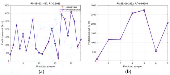 The fitting status of the output torque neural network: (a) represents the fitting results for the 23 training set samples; (b) represents the fitting results for the 7 testing set samples.