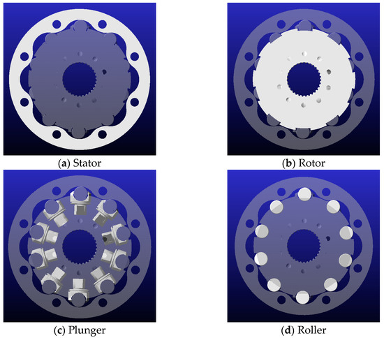 In other areas, valuable research exists. Hui Shen et al. [21] established a dynamic model of axial piston pumps to study piston motion under different conditions, analyzing the effects of the hydraulic pressure, piston radius, and radial clearance on the forward displacement, contact radius, maximum contact pressure, and other aspects. Junhui Zhang et al. [22] proposed a neural network model for assessing noise in axial piston pumps. Gautham Ramchandran et al. [23] investigated a novel numerical method to simulate the physical processes of piston operation within radial piston pumps. Daniel Nilsson et al. [24] conducted extensive testing on hydraulic motor extreme conditions, presenting three stages of motor stalling. Lifu Cheng et al. [25] compared the fatigue characteristics of composite materials and high-strength structural steel, confirming that composite materials can replace traditional steel in hydraulic motors.