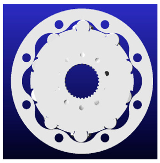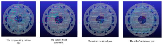 As shown in Figure 13, for the convenience of applying loads to the internal components of the motor and visually displaying the motion of the internal components during motor operation, the dynamic simulation focuses only on the core moving components of the radial piston motor. These components include the stator guide, rotor, piston, and roller.