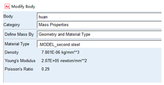 - Define Material Properties: the material setting interface in Adams is shown in Figure 15.