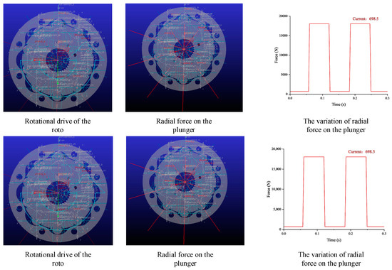 The simulation results of the dynamic model are shown in Figure 18 and Table 6. The torque simulation results exhibit pulsations caused by the inner curve of the stator ring. Improving the shape of the inner curve of the stator ring can reduce torque pulsations to some extent. The simulation terminates after the rotor rotates 90°, during which the plungers complete two radial expansion and contraction cycles.