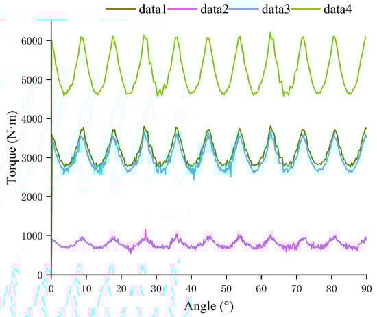 From Figure 18, it can be seen that when the inlet pressure of the hydraulic motor is high, the torque pulsations are significant. Under low inlet pressure conditions, the torque remains relatively stable.
