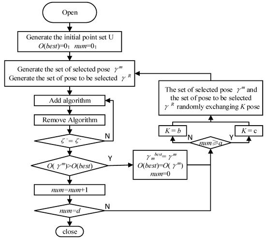 The iterative one-by-one pose search (IOOPS) algorithm is derived from the DETMAX algorithm [39]. The IOOPS algorithm can search for a given number of optimal poses within an infinite pose set. The flowchart of the IOOPS algorithm is shown in Figure 2. Firstly, an initial pose set U is randomly determined. The pose set U is divided into the selected pose set γm and alternative pose set γR. Secondly, the add algorithm and remove algorithm are used to select the optimal poses. The parameter descriptions of the IOOPS algorithm are shown in Table 2. Details of the add algorithm and remove algorithm are shown as follows: