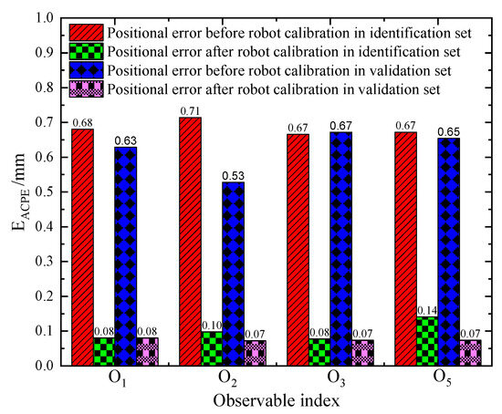 To verify the accuracy performance of the proposed hybrid observability index O6, 50 optimal poses were firstly selected from the sixth group. The identification results of the kinematic parameter errors of the Staubli TX60 robot are given in Table 5. The EACPE and EACAE of the Staubli TX60 robot is reduced from (0.716 mm, 0.167°) to (0.082 mm, 0.077°). The position and attitude accuracy performances of the Staubli TX60 robot are improved by 89% and 49%. The EMCPE and EMCAE of the Staubli TX60 robot is reduced from (1.187 mm, 0.281°) to (0.22 mm, 0.177°) by the LM algorithm. The position and attitude accuracy performances of the Staubli TX60 robot are improved by 81% and 37%. It can be seen that highly accurate parameter identification can be achieved based on the proposed hybrid observability index O6.