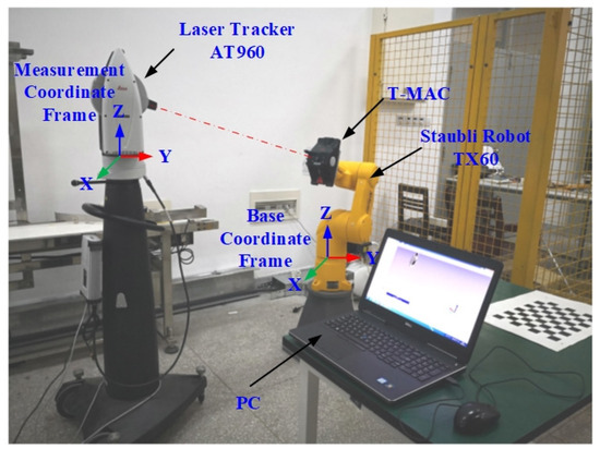 As shown in Figure 5, the industrial robot calibration system is established in this paper. The laser tracker Leica AT960 is used to measure the poses of the Staubli TX60 robot. The T-Mac tool of the laser tracker is installed on the industrial robot flange. Spatial Analyzer and Matlab are used for processing the measured data. The positioning measurement uncertainty of the laser tracker is 15 μm + 6 μm/m × Dm. D indicates the distance between the laser tracker and the T-Mac tool. The measured distance in the experiment is nearly 1.5 m. The Staubli TX60 robot to be calibrated in this paper has a repetitive positioning accuracy of ±0.02 mm and a rated load of 3 Kg. The transformation relation between the measurement coordinate frame and the base coordinate frame can be obtained through the method presented in [40]. The experimental measurement procedure is as follows: