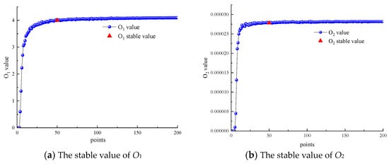 When the number of poses increases to a certain number, the identification accuracy does not increase. Therefore, the optimal number of poses should firstly be determined by the selection algorithm. In the algorithm, two random poses are selected among 200 measured poses initially. The six observability indexes of the selected poses are calculated. The above process is repeated T times. The number of randomly selected poses gradually increases. As shown in Figure 6a,b, it can be seen that the observability indexes O1 and O2 steadily increase when the number of poses reaches 50. From Figure 6c,f, it is shown that the observability indexes O3 to O6 increase monotonically. Therefore, the optimal number of poses is set as 50 for cross-comparison and fast calibration.