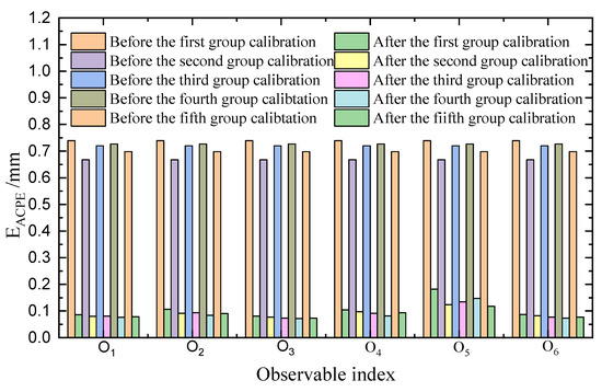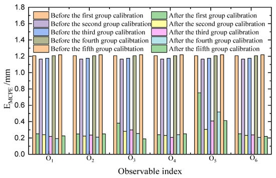 The results of robot calibration are shown in Figure 7 and Figure 8. EACPE of the O1, O3, and O6 are almost identical. The EMCPE of the proposed O6 is better than O3. As summarized in Table 4, it can be seen that the calibration performance of the proposed hybrid observability index O6 is more stable than other observability indexes.