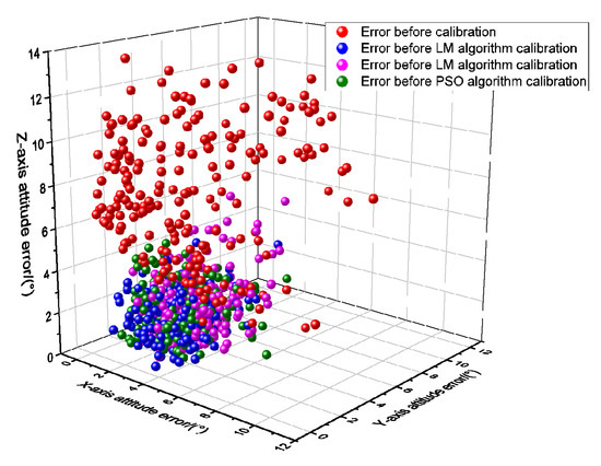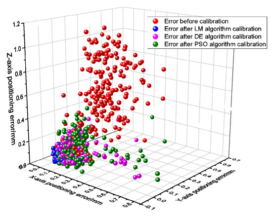 The calibration performance of the LM, PSO, and DE algorithms are compared. The results are illustrated in Figure 9 and Figure 10. The EACPE and EACAE of the Staubli TX60 robot are reduced from (0.716 mm, 0.167°) to (0.2396 mm, 0.080°) by the PSO algorithm. Meanwhile, the EACPE and EACAE of the Staubli TX60 robot are reduced from (0.716 mm, 0.167°) to (0.1935 mm, 0.097°) by the DE algorithm. In summary, the accuracy of the parameters identified using the LM algorithm is better than the PSO and DE algorithms.