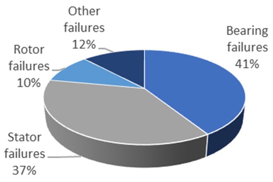 Accurate measuring, effective monitoring, and correct instrumentation are of great importance in today’s industry as they contribute to an improvement in the security, reliability, and availability of induction motors by means of the early detection and diagnostic of faults in these machines. These actions imply the proposal of innovative solutions and new diagnostic methods, combining different instruments and tools to achieve lower maintenance costs and the prevention of catastrophic and irreversible faults. In this regard, bearings are considered one of the most important components in the induction machine; however, they are usually one of the elements that fail the most in the motor, as shown in Figure 1. Due to this, any fault that occurs in these elements could give rise to greater damage in the machine and the process it is part of [].
