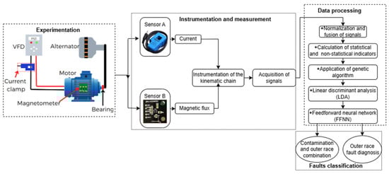 Because of the complexity of the detection and correct diagnosis of bearing faults, researchers have developed methodologies that employ a variety of measurement instruments to capture different physical magnitudes to enrich the data. An example is the work reported in [], in which the vibration, stray flux, and current signals were used to classify OR, peeling, electric erosion, and lubricant contamination damages in a metallic bearing with 2D DL techniques. Another method was proposed in [], considering a quantitative approach to estimate the severity of bearing damage by monitoring the displacement profile of the air gap and measuring current signals. The authors of [] classified metallic bearing faults related to the use and lack of lubrication by extracting time domain characteristics from current signals and comparing the results obtained with Artificial Neural Networks, k-NN, and Support Vector Machines (SVMs).