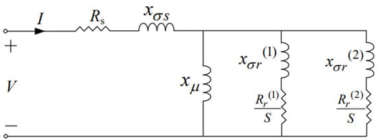 The kinematic chain was composed of a three-phase, 1 hp WEG induction motor, with a 3600 rpm nominal speed, whose equivalent circuit is shown in Figure 3, where () is the current, () the resistance, () the leakage inductance, () the reactance of the magnetizing branch, () the initial slip, () the leakage reactance of the first and second branches of the rotor circuit, and () the resistance of the first and second branches of the rotor circuit []. This motor is connected to an automotive alternator, which represents 30% of the nominal load of the motor, both connected through a pulley and belt transmission system. The motor is powered by a WEG SFW 08 Variable Frequency Drive (VFD).