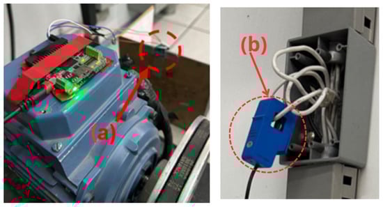The colocation of the sensors is shown in Figure 4. The magnetometer was installed 15 cm away from the data plate to avoid saturation during the measurements (please see Figure 4a), and the ammeter clamp was connected to one of the lines powering the motor (Figure 4b).