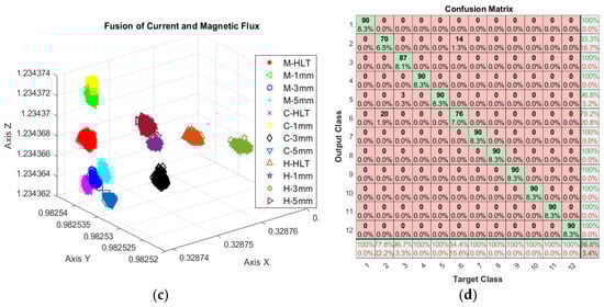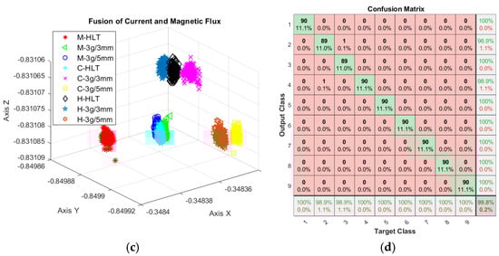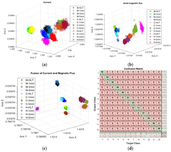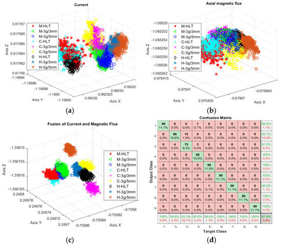 In a similar manner to the previous cases, with the 60 Hz supply frequency, the results are exposed in Figure 9. Current (Figure 9a) and stray flux (Figure 9b) data show the overlap of the classes under study, reaching low accuracy levels of 56.7% and 62.5%, respectively, with the classification model. In contrast, Figure 9c presents a substantial improvement in the cluster separation due to the fusion of the signals, allowing the FFNN to obtain a 99.8% accuracy for the classification of all conditions, as observed in the confusion matrix in Figure 9d.