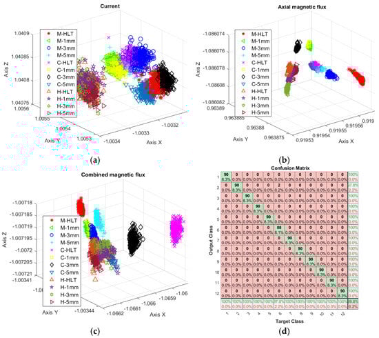 Classification of OR faults with a supply frequency of 60 Hz: (a) current data; (b) axial stray flux data; (c) current and magnetic flux data fusion; (d) current and magnetic flux fusion confusion matrix.