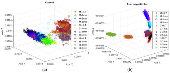 In this section, the results obtained from the analysis of the data collected in the experiments described in Section 2.1, using the methodology defined in Section 2.3, are presented. In all the cases shown in this section, the results achieved with the fused data were compared to the results with the current and stray flux signals individually processed; additionally, from the three acquired stray flux signals, only the one corresponding to the axial flux component was used, as it was shown to provide better information compared to the other components.