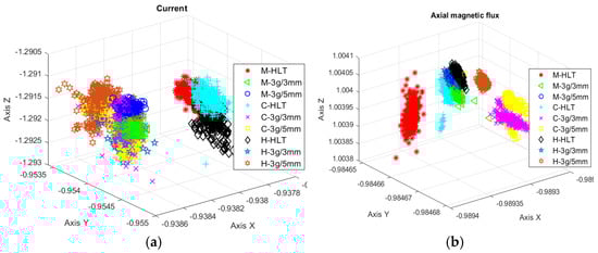 The data fusion process starts with the feature calculation stage; the feature matrices contain the indicators for all the captured signals. Then, the GA reduces the dimension of the feature matrices by determining those that allow a better separation of the conditions under study. Finally, the LDA reduces the remaining features to a 3D projection of the classes, generating a graphic representation that shows the segregation of the clusters of fused features from the current and stray flux signals for all the conditions.