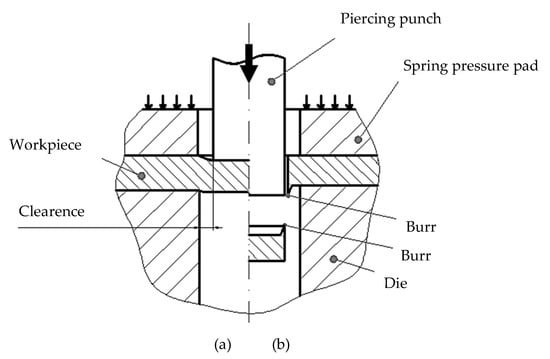 As previously mentioned, the sheet punching process involves the rectilinear movement of a punch during the working stroke, which gradually penetrates the material of the workpiece and subsequently into the hole in the die, causing the separation of a part of the workpiece in the form of a sheet or strip (Figure 1). The workpiece is initially placed between the puncher and the die, and, in some cases, before the puncher acts on it, it is subjected to a pressing on the die plate. In this way, creases are avoided on the supposedly flat surface of the obtained part. As a result of the process, a burr of a certain thickness and height may appear on the surface of the workpiece resulting from the exit of the puncher after punching or on the entrance surface of the part separated from the workpiece.