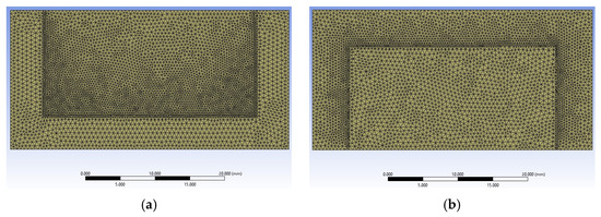 Graphical representations of workpiece’s mesh: (a)—mesh distribution on the upper face of the workpiece; (b)—mesh distribution on the lower face of the workpiece.