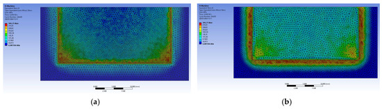Graphical representations of initial stress evaluated according to von-Mises criteria: (a)—top view over the assembly; (b)—bottom view over the assembly.