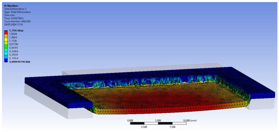 The total deformation is evaluated in three directions corresponding to the three axes of the global coordinate system. Before the process is complete, analysis reveals an intermediate result with burrs remaining and others just forming as the puncher cuts the workpiece (Figure 4). It peaks at 2.2803 mm in the estimated timeframe.