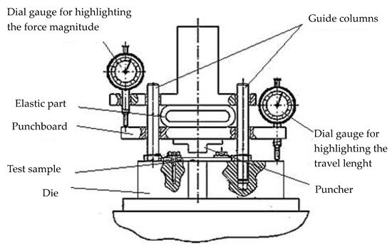 The movement of the punch towards the die takes place by means of an actuation plate and a punch holder plate. Two columns are used to guide the movement of the two plates. A spring steel deformable elastic part placed between the drive plate and the punch holder plate was supposed to provide information on the magnitude of the force that produces a certain deformation of the test sample material as a result of the movement of the punch in the working stroke.