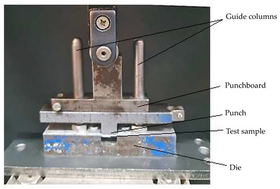 As such, the device was placed on a universal tensile testing machine (WDW type, made in China). In Figure 6, an image obtained during the shearing process can be observed in the area corresponding to the action of the active edge of the punch in the case of an aluminum alloy test sample.