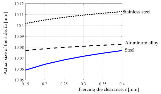 The influence of clearance c on the actual size La of the square hole side in the case of the three sample materials (t = 1.5 mm, v = 50%, Li = 10 mm).