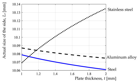 The influence of workpiece thickness t on the actual size La of the square hole side in the case of the three sample materials (c = 0.25 mm, v = 50%, Li = 10 mm).