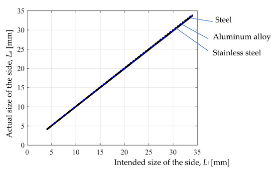 Analysis of the empirical mathematical models and graphical representations in Figure 8, Figure 9 and Figure 10, corresponding to mathematical models (1), (2), and (3), established for the actual size La of the square-shaped hole side led to the observations mentioned below.