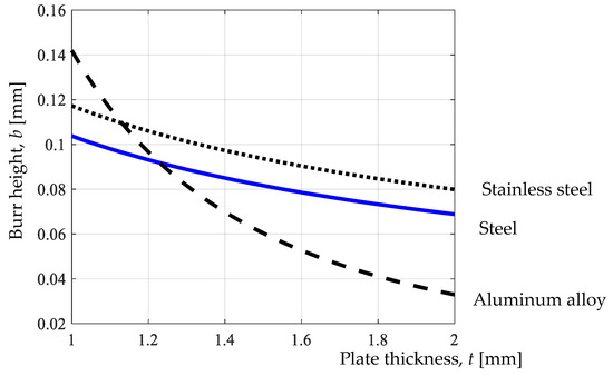 The input factor with the greatest influence on burr height b is workpiece thickness t, since, in all three empirical mathematical models, the exponent attached to this factor has the largest absolute value. It is also found that the exponent attached to the t factor has a negative value, which means that an increase in thickness t results in a decrease in burr height b. This variation could be explained by the increasing stiffness of the test sample with increasing thickness t and generating, as such, a burr of lower height. The most pronounced decrease in burr height b is found in the case of aluminum alloy Al Mg3. It could be explained by the higher plasticity of this material, which deforms without generating a burr of higher height.
