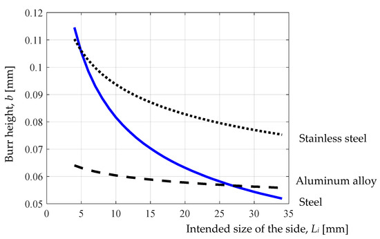 It is also observed that an increase in the intended size Li of the square hole side leads, in all three cases, to a decrease in burr height b, since the values of the exponent attached to the Li factor are negative. Such a result could be explained by the fact that an increase in the square hole side could prevent the generation of a higher burr over a longer length. The strongest influence is found in the case of steel 1.033, since the absolute value attached to the Li factor in Equation (4) is the largest.