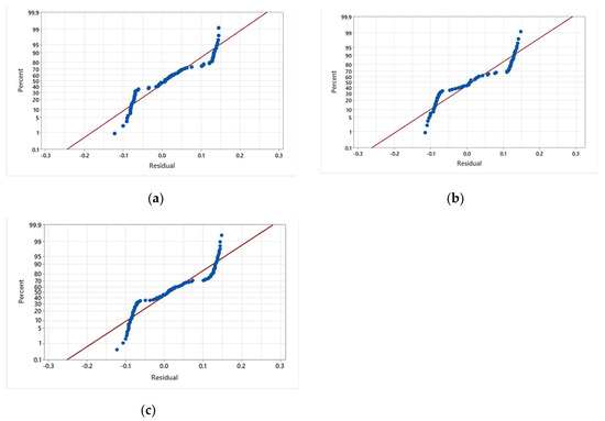 Normal probability plots for the regression equations corresponding to the actual size La of the square holes made by cold punching for the three materials: (a)—steel 1.033; (b)—aluminum alloy AlMg3; (c)—stainless steel X5CrNi18-10.