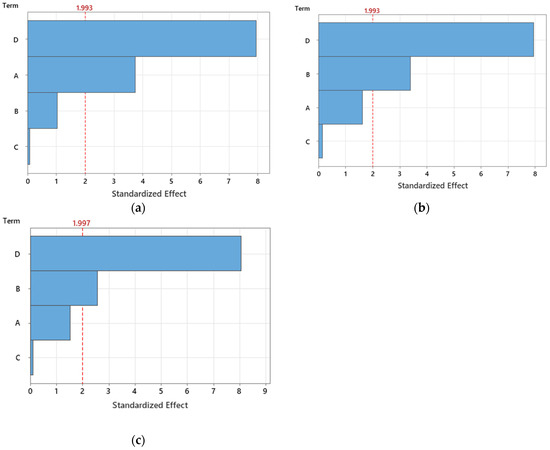 Pareto charts can be used to evaluate the level of influence of some variables on the size of a parameter of interest. The development of such diagrams in the case of the experimental tests led to the graphic representations in Figure 15. A red line was used to reveal the factors with significant influence, the crossing of which by the bars corresponding to certain factors means that the respective factors have a significant influence. For the investigated situation, clearance c and sheet thickness t can thus be considered significant factors. It can be stated that clearance c is the factor with the greatest influence on the actual size La of the square hole side.