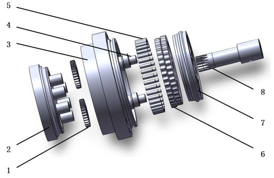 The model of the RV reducer. 1—Planetary gear; 2—output shaft; 3—pin wheel housing; 4—crankshaft; 5—pinwheel; 6—cycloid gear; 7—rigid disk; and 8—input shaft.