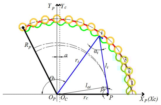where γi is the pin position vector’s azimuth, φi represents the azimuth of the cycloid gear’s contact point, ϕi denotes the original angle of the crank. Rₚ represents the pin radius, a represents the eccentric distance of the crank, Zₚ denotes the cycloid gear’s tooth count, and iH depicts the transmission ratio.