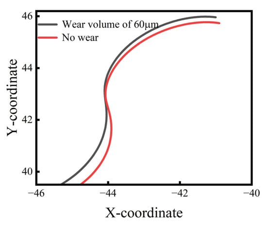 The wear volume along the cycloid gear’s tooth profile at different working hours is shown in Figure 10. The product of the wear coefficient and average contact pressure had a minor impact on the wear volume calculated by (20). The shape of the wear volume curve resembled that of the relative slip distance, varying at different meshing angles. Considering the significance of transmission accuracy, the subsequent calculations used the maximum wear volume from six simulations, which were 10, 20, 30, 40, 50, and 60 μm, respectively.