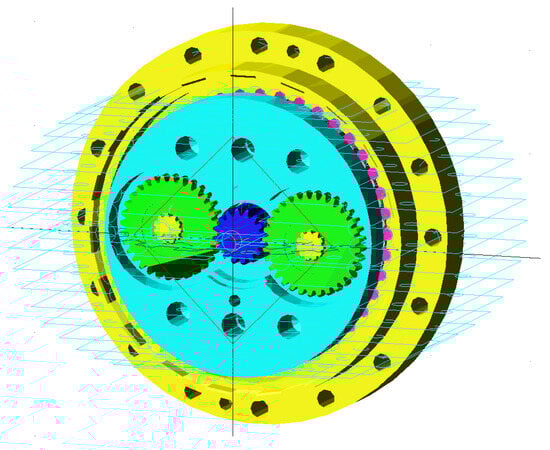 The material properties of the parts are correctly assigned, and the unit is set to MMKS. The constraints in Table 3 are intended to ensure that the parts are attached in the right way. The contact forces based on impact functions are utilized to simulate the interaction forces between gears, including elastic and damping forces []. Figure 5 shows the RV reducer’s mechanism.