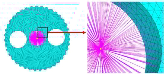 Given the principle of motion of the RV reducer, a rigid point is established at the geometric center of the two cycloid gears, respectively, which coincides with the center of rotation. The center of rotation is rigidly connected to the surface nodes of each gear hole, and the cycloid gear rotation is achieved by releasing the Z-axis rotational degree of freedom. Figure 6 displays the finite element model. Then, the respective model center file (.MNF file) is generated, replacing the rigid body with the flexible body; thus, the rigid–flexible coupling model was established.