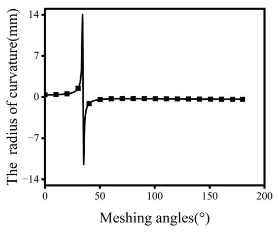 With an input angular velocity of 9000°/s and a load torque of 412 Nm, Figure 7 shows the cycloid gear’s radius of curvature curve at different meshing angles. Around the meshing angle of 35°, the radius of curvature changed drastically due to the concave-convex transition of the tooth profile.