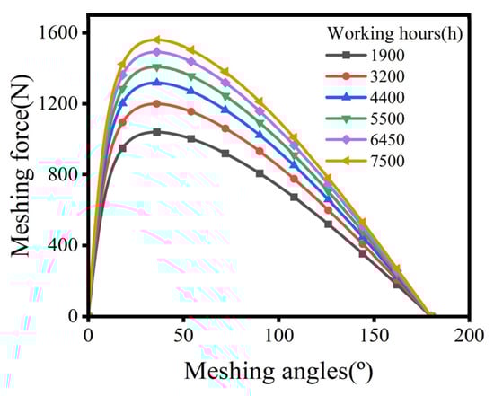Figure 8 illustrates the impact of working hours on the meshing force. It shows that as the working hours increase, the meshing force increases, but it increments, and the quantity of meshing tooth pairs decreases.