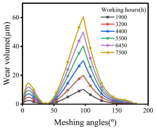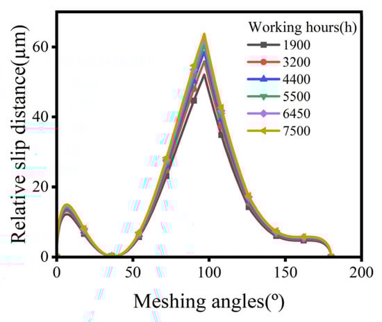 Figure 9 presents the distribution of the relative slip distance for a single pair of meshing teeth along the tooth profile. The relative sliding distance approximates zero around a meshing angle of 35° due to the drastic change in curvature radius and the profile of the cycloidal gear approximating a half-plane. Additionally, two wear peaks appear around the meshing angle of 6° and 100°, which may be due to the higher linear speed of the pin gear or the larger contact half-width. The relative slip distances at different meshing angles rose unevenly with increasing working hours, implying that various positions of the tooth profile have different sensitivities to wear.