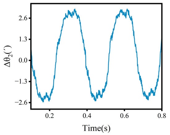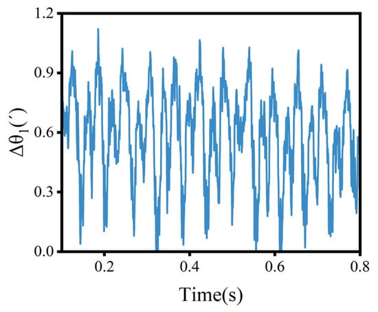 Figure 14 displays the input and output speeds. Figure 15 illustrates the TE curve, with an average value of 0.2278′. In addition, the shape of the TE curve was affected by the load, mapping the sinusoidal pattern. The cycle of TE was approximately 0.3 s, with significant fluctuations reaching around 5.2′, which may be caused by the instability of the load.